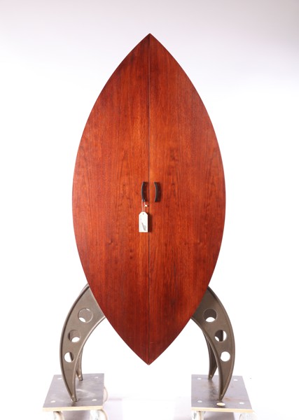 Teak, ben och handtag i metall, inköpt 2011 på Indori, Nacka, Stockholm, Svensk design, endast ett exemplar tillverkat i detta utförande, skjutbara dörrar, invändigt med hyllplan och lådor, Hö 184, br 76, dj 50,5 cm